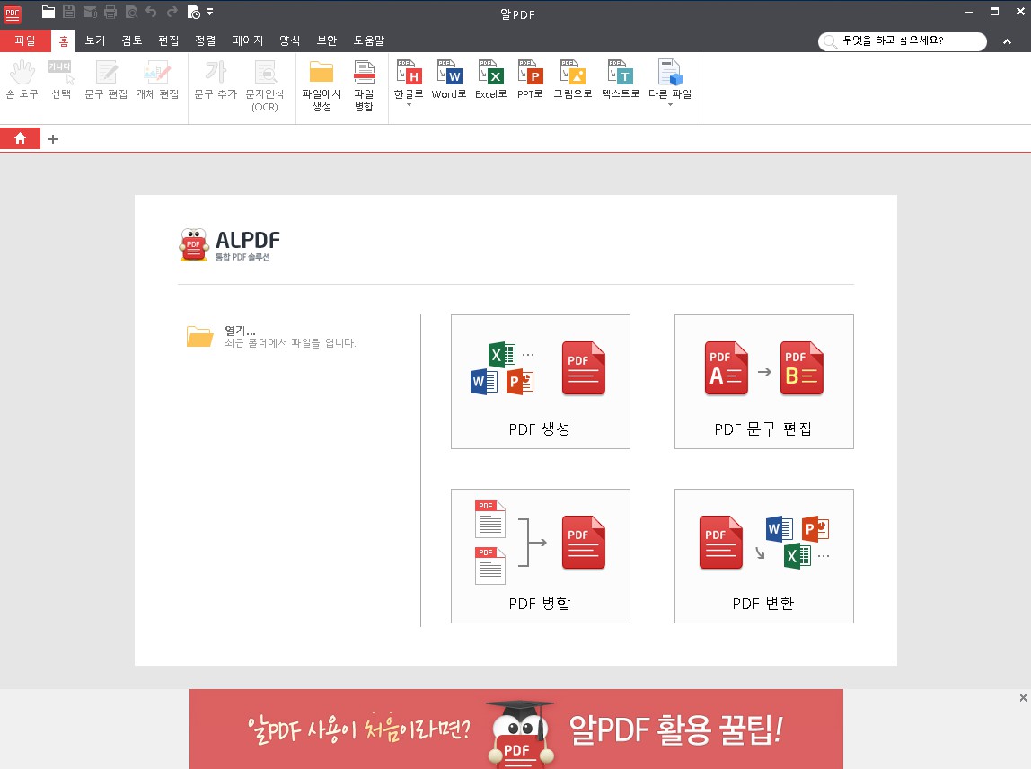 최초로 실행을 하면 위와 같은 모습으로 실행이 됩니다. 깔끔한 인터페이스를 볼 수가 있습니다. 알 PDF 는 단순리더로써의 기능뿐만이 아니라, PDF 파일을 생성하고 편집을 할 수 있는 기능을 갖추고 있습니다.