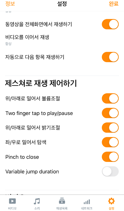 또한 위에 보는 것처럼 아주 다양한 메뉴가 존재합니다. 모바일에서 사용할 때 한손으로 올리면 볼륨이 올라가소 옆으로 쓸면 앞으로 가기 뒤로가기를 지원하기 때문에 모바일 시청시 아주 편리합니다.