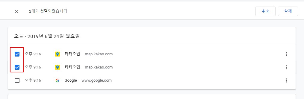 위의 모습처럼 보이게 됩니다. 아마 여기서 부터는 직관적으로 사용이 가능한데요. 주소 앞에 체크박스를 선택하면 개별적으로 지워줄 수가 있습니다.