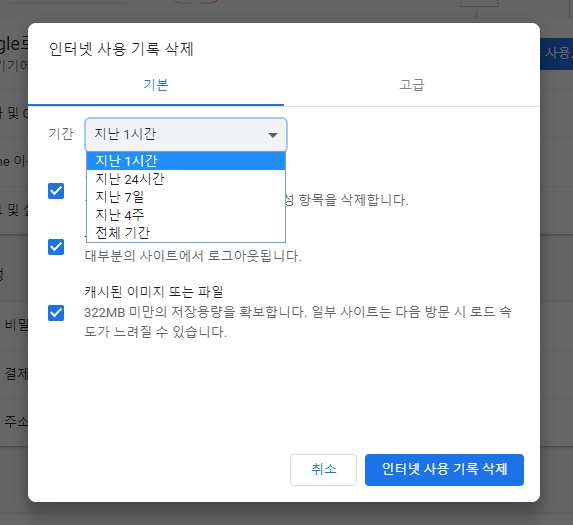 기간을 설정하면 삭제하고 싶은 기간을 삭제할 수가 있습니다. 몇가지 기간이 표시가 되기 때문에 여러가지 옵션으로 삭제를 할 수가 있습니다.