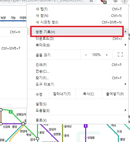 다른 메뉴들도 많지만, 방문기록을 삭제할 것이기 때문에 해당 메뉴를 선택해 줍니다. 이렇게 선택을 하면 그동안 자신이 방문했던 사이트들이 날짜별로 자세하게 표시가 됩니다.