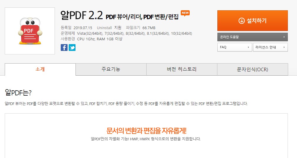 처음 소개하는 프로그램은 이스트 소프트웨어에서 나온 알 PDF 입니다. 현재 2.2 버전이 최신 버전입니다.