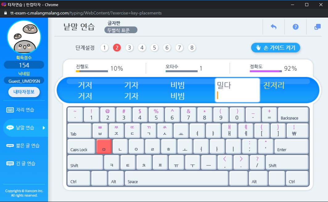 기본적으로 손가이드가 껴짐으로 설정이 되어 있으면 이렇게 화면에 보는 것 처럼 손가락이 화면에 표시가 되게 됩니다. 이럴때 손가이드 끄기를 눌러줍니다. 그러면 손가락 모양이 화면에서 표시가 되지 않습니다. 좀더 깔끔하게 타이핑 연습을 할 수가 있습니다.