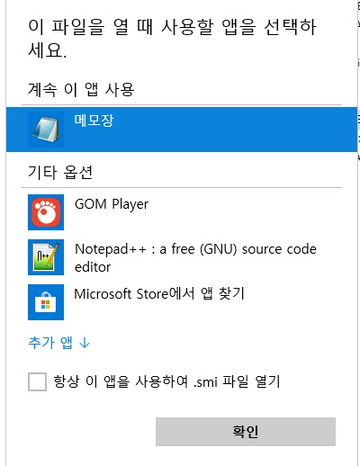 smi 파일은 일반적인 텍스트 파일이기 때문에 아무 텍스트 에디터를 통해서 열 수가 있습니다. 하지만, 일반적으로 윈도우 탐색기에 연결 프로그램이 등록되어 있지 않아, 바로 열리지가 않는 것입니다. 이럴 때는 윈도우 오른쪽 메뉴에서 연결 프로그램을 등록해 열어 줄 수가 있습니다.