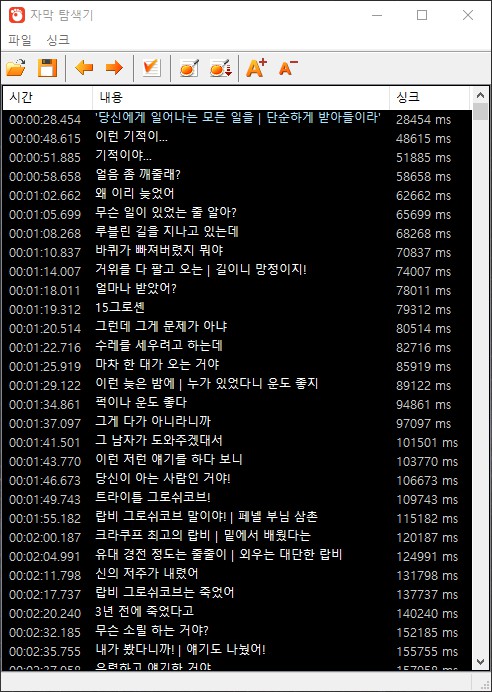 자막 탐색기를 통해서 파일을 연 모습입니다. 이렇게 탐색기를 통해서 파일을 열어보면 싱크 보정도 쉽게 할 수가 있고, 새로운 자막을 넣어 볼 수도 있습니다. 아무래도 자막에 특화된 프로그램이다 보니 손쉽게 수정을 할 수가 있습니다.