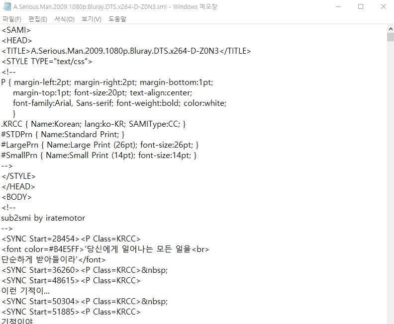 메모장을 통해서 파일을 열어 본 모습입니다. 일반적인 HTML 파일 형식으로 보입니다. 원래 smi 자막 파일은 html 기반으로 만들어져있기 때문에 이렇게 보입니다.