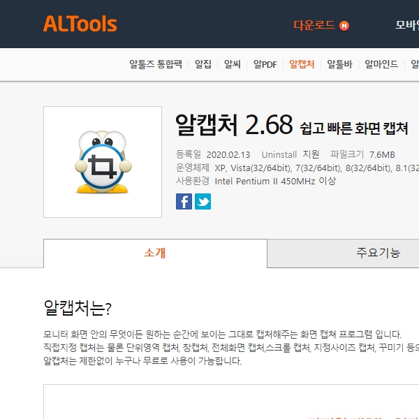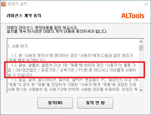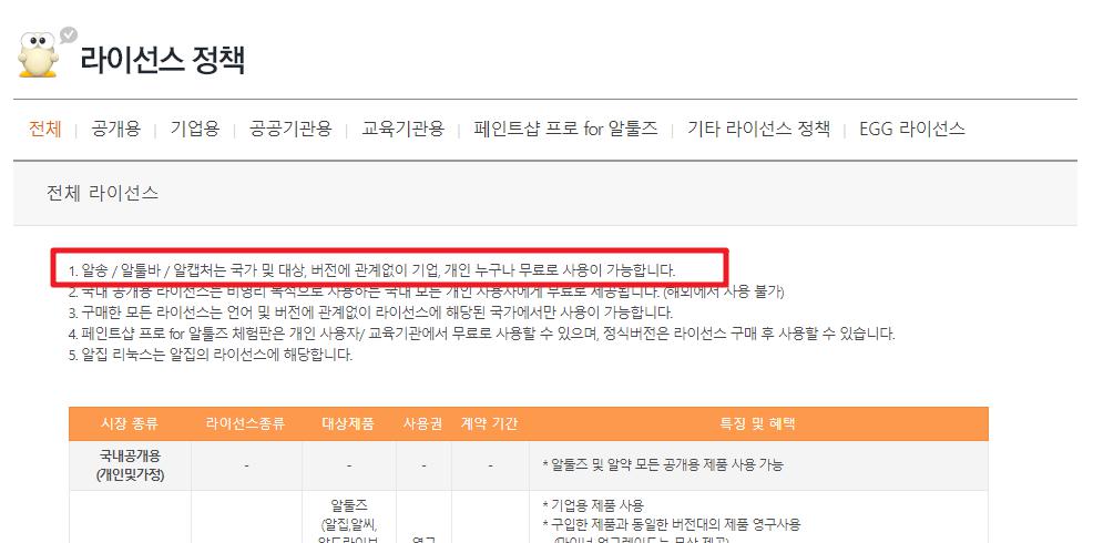 보통 다른 프로그램 같은 경우 개인에게는 무료로 제공을 해도 기업 사용자는 무료로 사용을 할 수가 없습니다. 그런데 알송, 알툴바, 알캡처는 무료로 제공을 하고 있습니다.