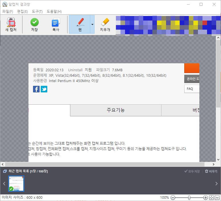 알캡처를 사용해서 캡처를 하고 나면 캡쳐된 이미지가 바로 결과창에 나타나게 됩니다. 자동으로 나타나기 때문에 번거롭게 실행을 할 필요가 없습니다. 해당 화면에서 간단한 이미지 편집 작업이나 저장, 삭제 작업을 할 수가 있습니다.