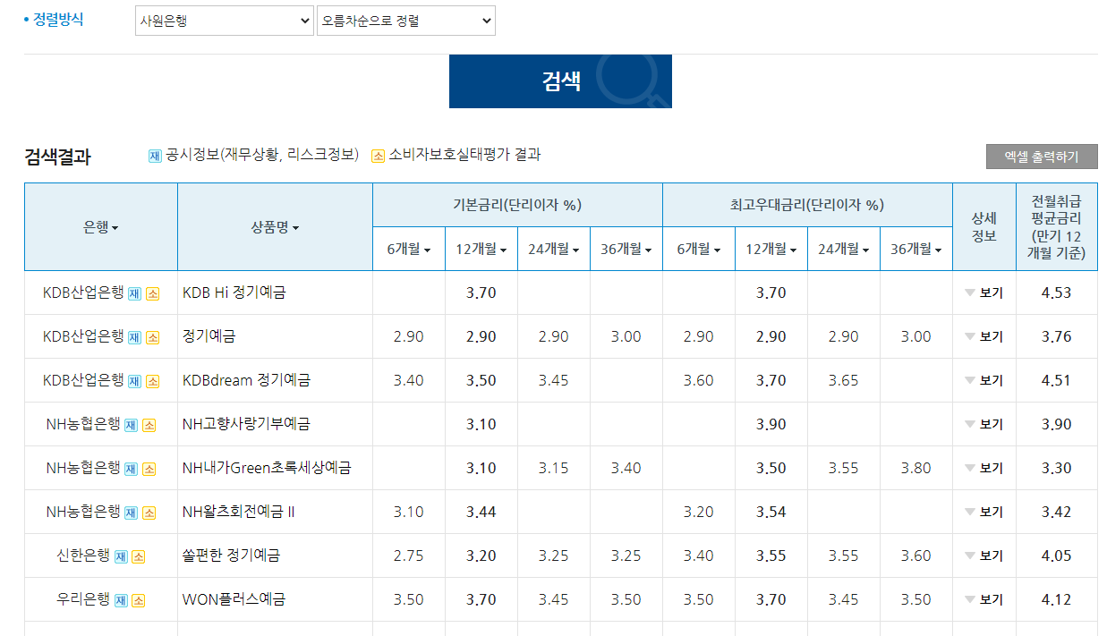 페이지가 조금 복잡해 보이지만, 그만큼 정확한 정보를 보여주고 있습니다. 다양한 정보를 한눈에 보여주는게 특징인 것 같습니다. 기간별로 나누어 보여주고, 단리, 복리 이자도 구분해서 보여주고 있습니다. 가입방식 까지 옵션을 통해 검색할 수 있는 것이 인상적입니다. 복리로 금리를 주는 곳은 흔치 않은데, 해당 옵션을 통해서 그런 은행까지 검색을 해볼 수가 있네요.