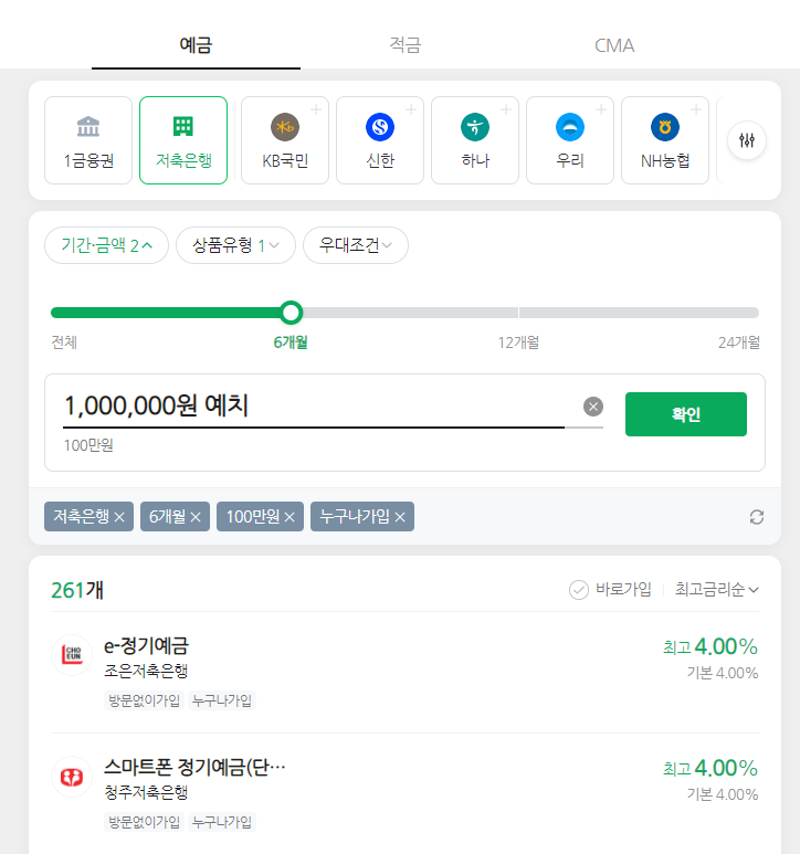 또한 기간별로 예치를 할 경우 가장 높은 금리의 은행이 어딘가도 살펴볼 수 있습니다. 기간 탭을 통해 기간과 금액을 설정하면 거기에 맞는 가장 높은 금리를 자동으로 찾아 줍니다.